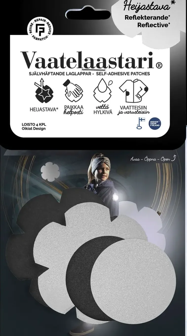 Fabpatch Vaatelaastari On Helppo Hankaamalla Kiinnittyvä Suomessa Valmistettu Tekstiilien Korjauspaikka. Tekstiilimateriaali On Heijastinkangasta. Valmiiksi Muotoon Leikatut Paikat Ovat Kooltaan: 2 X Medi 70Mm 2X Mini 50Mm
