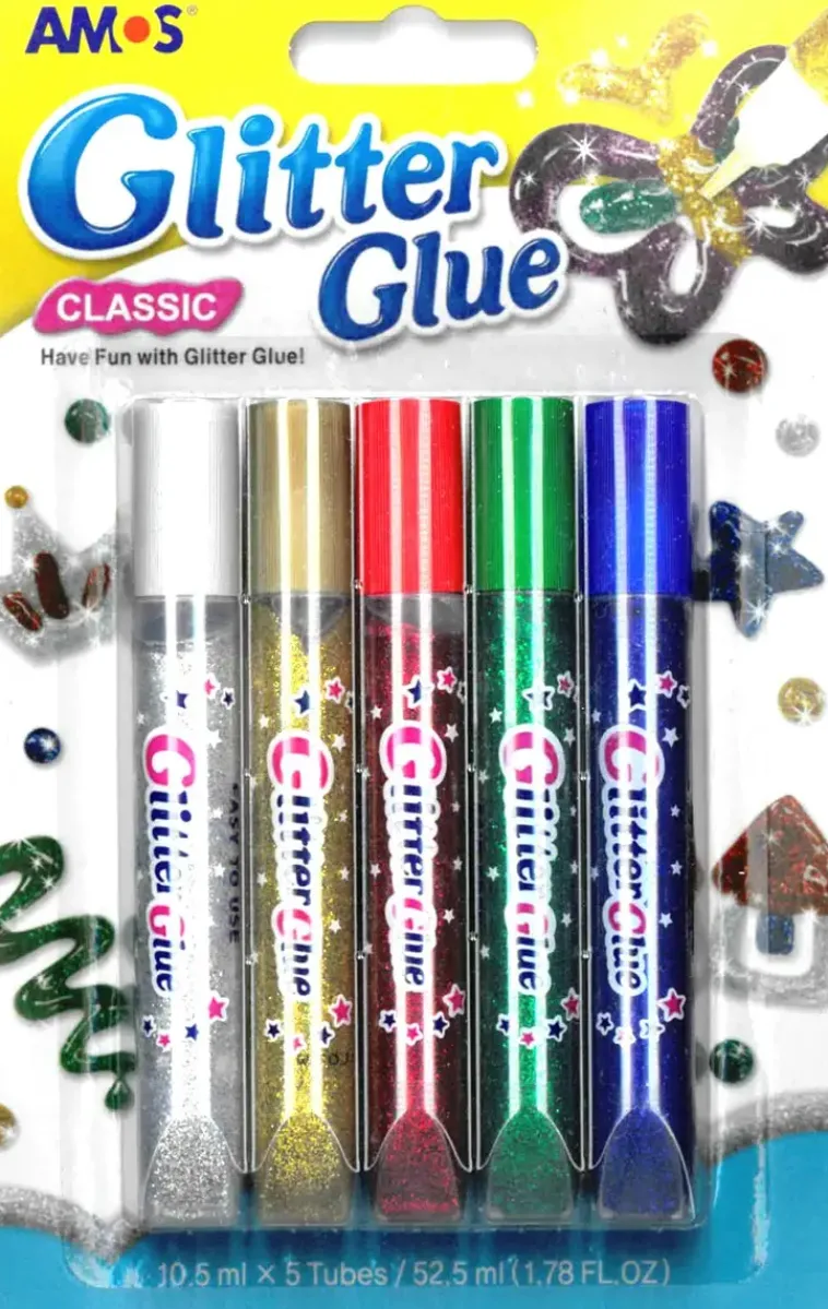 Pakkaus Sisältää Viisi Kappaletta Eri Värisiä Kimalleliimakyniä.