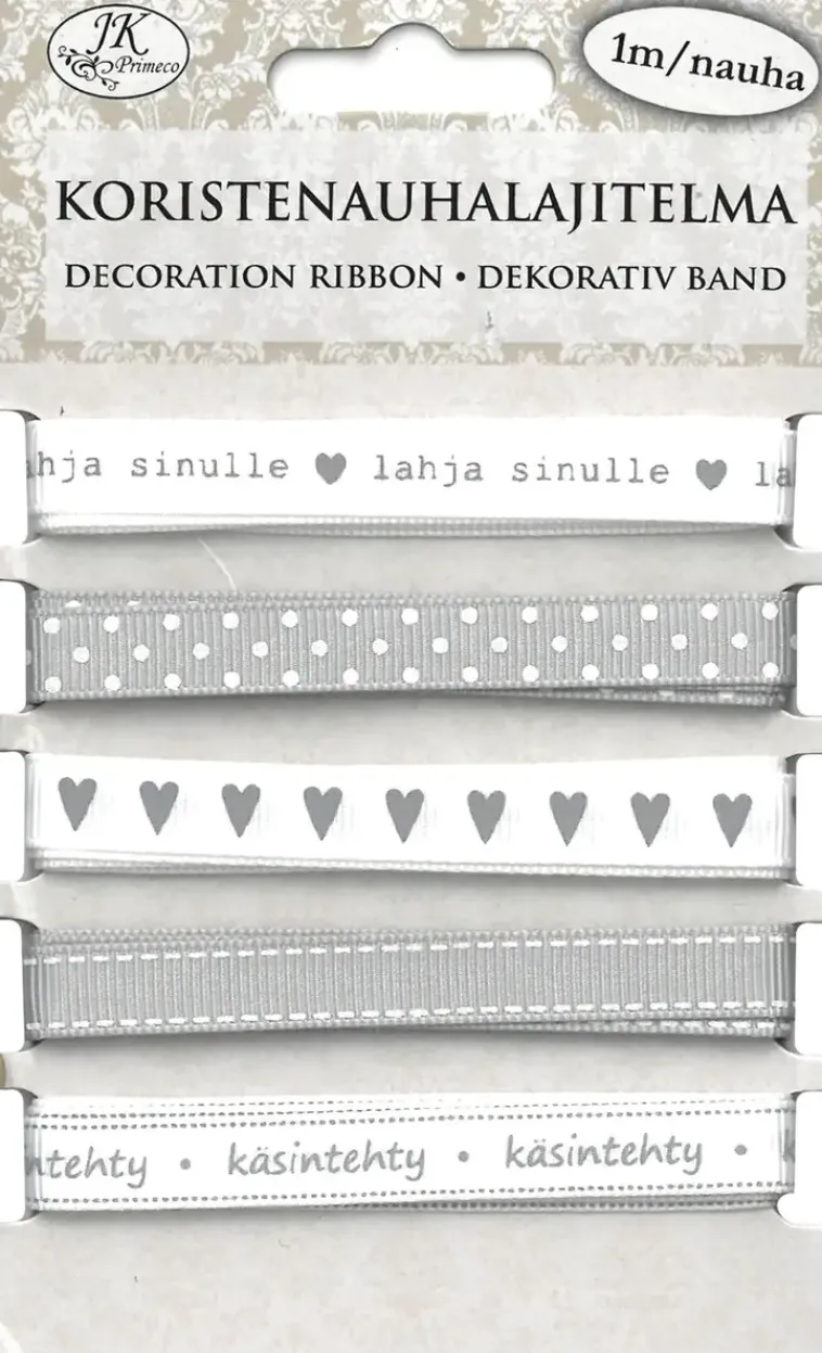 Pakkaus Sisältää Viisi Erilaista Koristenauhaa, Jokaista Nauhaa 1 Metri. Sopii Korttiaskarteluun, Skräppäilyyn Ja Koristeluun. Nauhan Leveys N. 1Cm.
