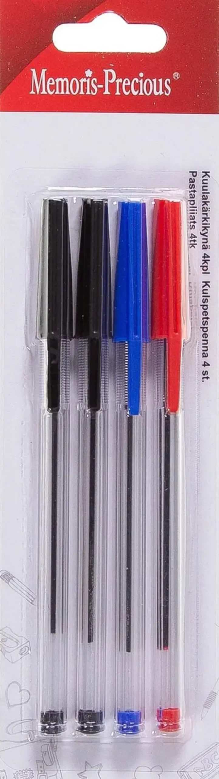 Kuulakärkikynäsetti. Pakkauksessa 1 Punainen, 1 Sininen Ja 2 Mustaa Kynää.