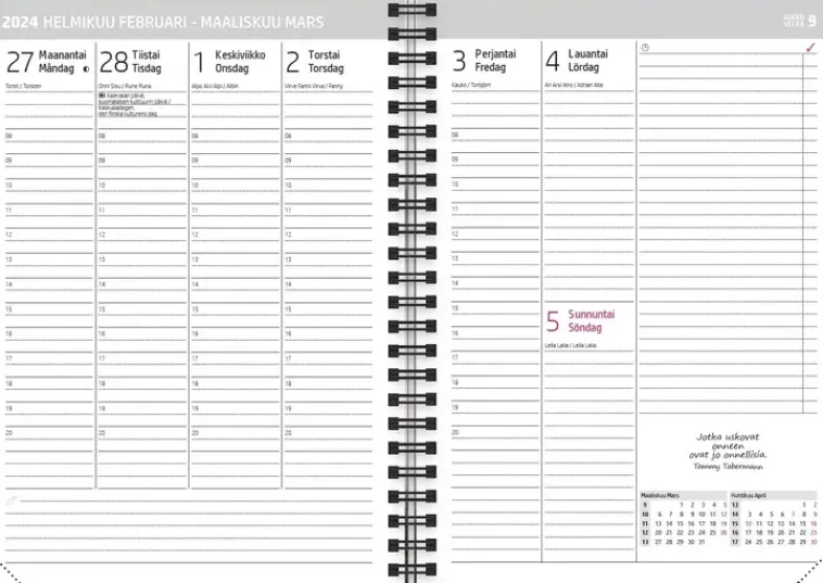 Tommy Tabermannin Runot Ovat Pääosassa Tässä Vuoden 2024 Kalenterissa. Seesteinen Kansitaide Luo Rauhallisen Tunnelman. Viikkonäkymässä On Riittävästi Tilaa Muistiinpanoille Ja Vaikkapa Omille Runoillesi! Tässä Kartonkikantisessa Kierresidotussa Mallissa On Kaksikielinen Viikkonäkymä (Suomi Ja Ruotsi), Ja Se Pysyy Pöydällä Avattuna. Suomalaiset Nimi- Ja Juhlapäivät. Sisältää Vuosisuunnitelman, Liputuspäivät, Suomenkieliset Nimipäivät Ja Runsaasti Viivoitettua Muistiinpanotilaa Ja Tehtävälistoja. Valmistettu Fsc-Sertifioidusta Paperista.
