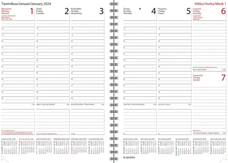 Tehokas Ja Loistelias Kalenteri Päivittäiseen Käyttöön. Koko 148 X 210 Mm (A5); Parikierresidottu; Leatherette-Kannet; Kielisyys: Suomi, Ruotsi, Englanti; 2024 Yleiskalendaario; Päiväkirja 52/2023–1/2025; Vuosisuunnitelmat 2024 Ja 2025; Kansalliset Vapaapäivät; Suomalaiset Ja Suomenruotsalaiset Nimipäivät; Auringon Nousu- Ja Laskuajat (Helsinki, Oulu); Kansainvälinen Aika; Runsaasti Muistiinpanotilaa; Kynä Ja Kynänpidike; Fsc®-Sertifioitu Tuote.