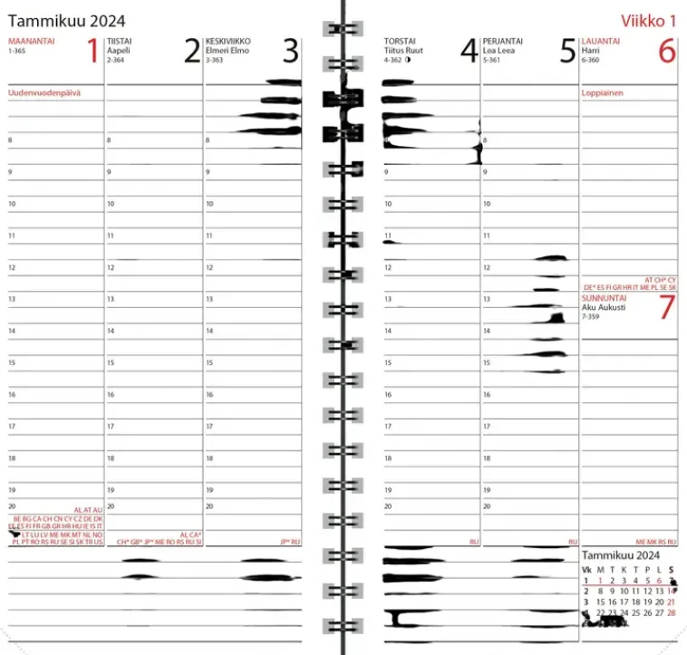 Klassikkokalenteri Päivittäiseen Käyttöön. Koko 85 X 162 Mm; Leatherette-Kannet; Parikierresidottu; Aukeamalla Viikkonäkymä; Päiväkirja 48/2023–2/2025; Vuosisuunnitelmat 2024 Ja 2025; Kansalliset Vapaapäivät; Suomalaiset Nimipäivät; Muistiinpanosivuja; Euroopan Kartta; Kynänpidike; Avainlippu-Tuote; Fsc®-Sertifioitu Tuote.