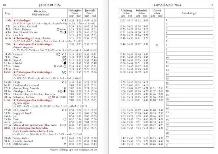 Äkta Och Ursprunglig. Format 105 X 148 Mm; Stiftad; 80 Sidor; En Månad Per Uppslag; Alfabetisk Namnsdagsförteckning; Solens Och Månens Upp- Och Nedgång På Olika Orter; Andra Astronomiska Uppgifter; Meteorologiska Tabeller; Kyrkliga Helgdagar Och Förteckning Över Marknads- Och Torgdagar; Aktuell Artikel; Gråa Papperspärmar; 100 % Finsk; Fsc®-Sertifierad Produkt.