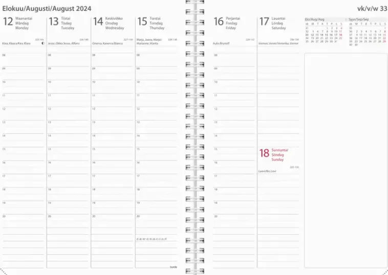 Kartonkikansi Hopeapainatuksella, Kuminauhalla. Kalenterin Aukeamalla Yksi Viikko, Tuntijaotus 08-20, Palsta Muistiinpanoille, Kuluvan Ja Seuraavan Kuukauden Kalenteritaulukot. Kalenteri Sisältää Nimipäivät, Juhlapyhät, Liputuspäivät, Kuun Vaiheet, Vuosisuunnitelmat Kuluvalle Ja Seuraavalle Vuodelle, Vuosiruudukot Edelliselle, Kuluvalle Ja Kahdelle Seuraavalle Vuodelle, Kalendaariset Tiedot, Auringon Nousu- Ja Laskuajat, Yleiset Pyhäpäivät Maailmalla Ja Muistiinpanosivut. Kalenteriosa: Vk 48 2023-Vk 1 2025. Kolmikielinen: Suomi/Ruotsi/Englanti. Parikierresidottu. Fsc®. Koko: 148X210 Mm (A5).