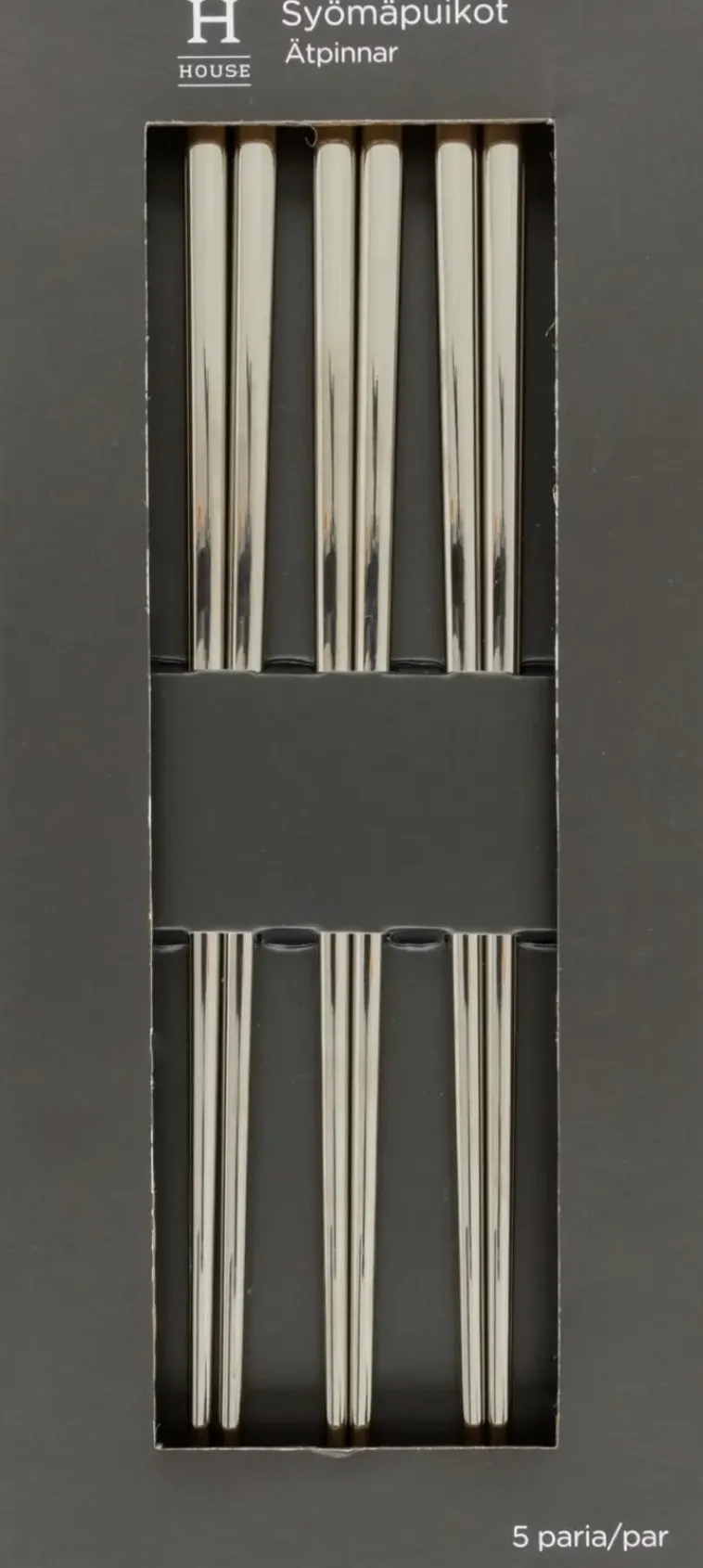 Ruostumattomasta Teräksestä Valmistetut Syömäpuikot. Syömäpuikkojen Pituus: 235 Mm. Paino/ Pari: 64 G. Pakkauksessa 5 Paria. Käsinpesu.