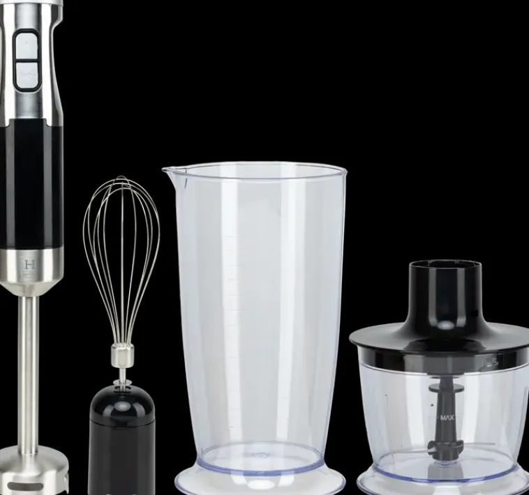 House-Sauvasekoitinsetti, Jossa Sekoitin-Ja Silppuritoiminto. Lisäksi Setissä On Kananmunanvalkuaiselle Soveltuva Vatkaintoiminto. Settiin Sisältyy Sauvasekoitin, Vispilä, Mittakulho 700 Ml, Minisilppuri Ja Silppurikulho 500 Ml. Laitteessa On Portaaton Nopeudensäätö Ja Ruostumattomasta Teräksestä Valmistetut Terät.