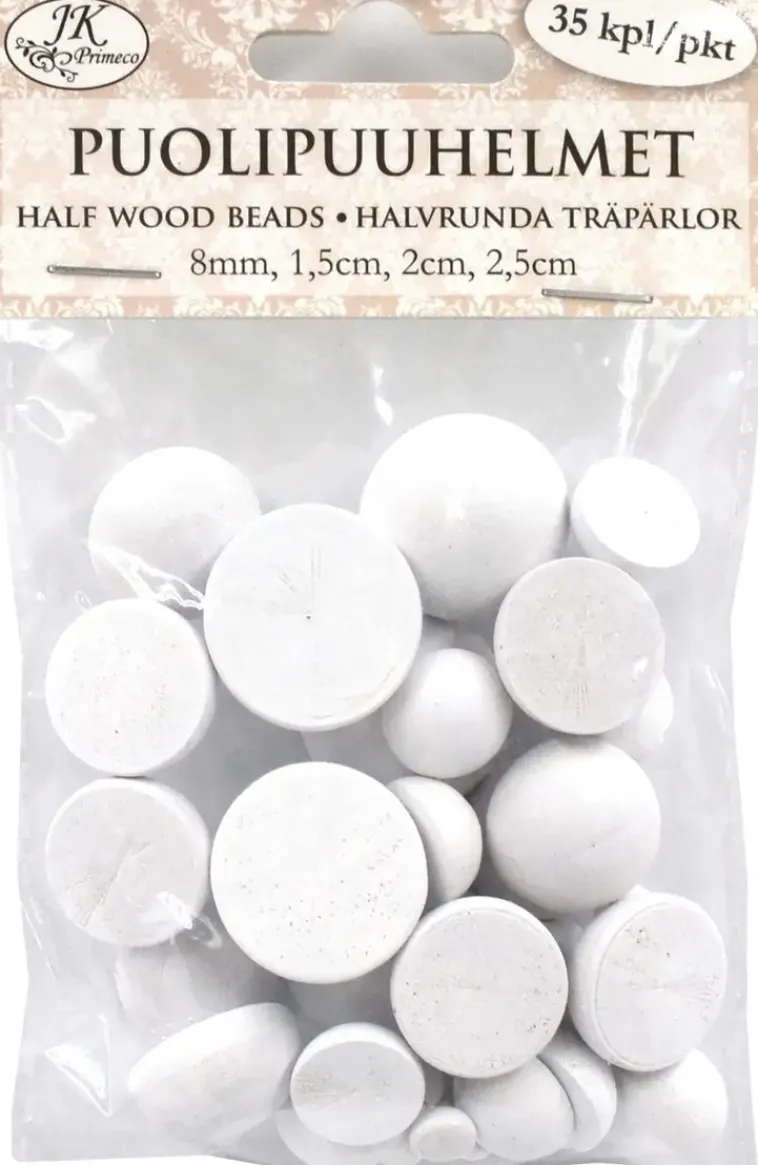 Lajitelma Puolikkaita Puuhelmiä Askarteluun Ja Koristeluun. Pakkaus Sisältää 35 Kappaletta Puolikkaita Puuhelmiä. Lajitelma Sisältää 8Mm-2,5Cm Kokoisia Puolipuuhelmiä