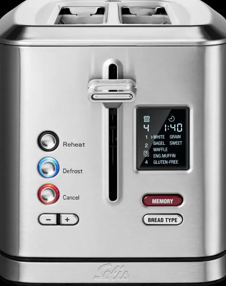 Teräksisellä Solis Flex Toaster Paahtimella Paahdat Parhaat Leivät Päivän Jokaiseen Hetkeen. Laitteessa On Seitsemän Paahto-Ohjelmaa Vaaleaa Tai Täysjyväleipää, Bageleita, Vohveleita, Muffinsseja, Pullia Ja Gluteenittomia Leipiä Varten. Voit Ohjelmoida Ja Tallentaa Suosikki Paahtoasetuksesi. Paahtoaste On Säädettävissä Ja Lisäksi Laitteesta Löytyy Sulatus-, Uudelleenlämmitys- Sekä Keskeytystoiminnot. Valaistut Toimintonäppäimet Lisäävät Käyttömukavuutta Ja Selkeältä Lcd-Näytöltä Näet Jäljellä Olevan Paahtoajan. Myyntipakkaukseen Kuuluvan Sämpylätelineen Avulla Lämpenevät Croissantit Aamiaispöytään Hetkessä. Irrotettava Murutarjotin Helpottaa Laitteen Puhdistusta. Takuu 6 Vuotta.