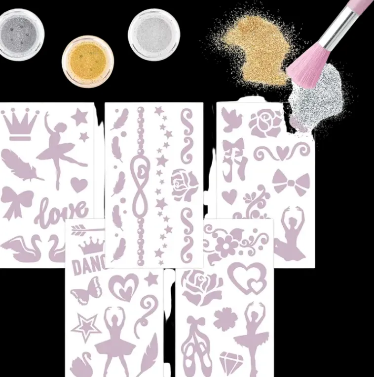 Upea Kimalletatuointisetti, Jossa Mukana Pohjat Erilaisiin Tatuointeihin, Pensseli Sekä Valkoinen, Hopeinen Ja Kultainen Kimallejauhe. Näillä Luot Ihollesi Kimaltelevan Säihkyvät Katseenvangitsijat!