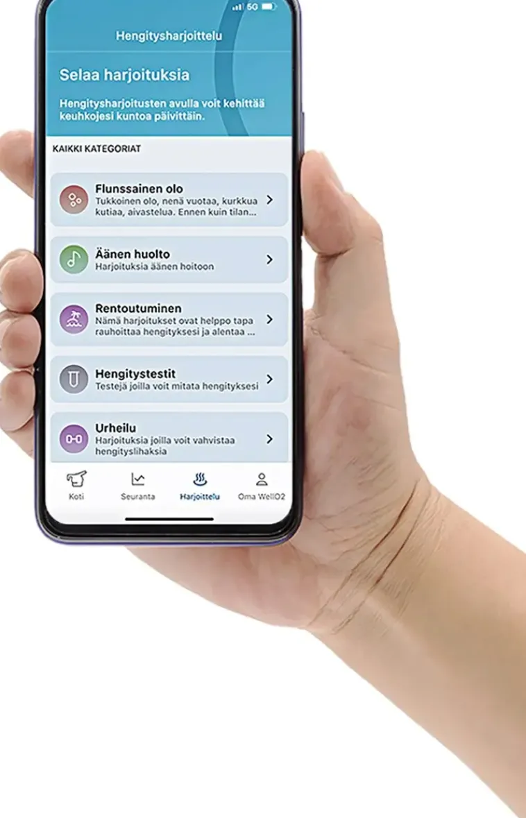 Wello2 Mybreath – Hengitä Älykkäämminhengityksen Vallankumous Alkaa Kotonasiwello2 Mybreath On Älykäs Suukappale Wello2-Laitteeseen. Sen Avulla Voidaan Mitata Tarkastikeuhkojen Hengityslihasvoimaa, -Virtausta Ja Kapasiteettia.Laitteen Myötä Voit Nyt Mitata, Seurata Ja Kehittää Hengitystäsi Ennenäkemättömällä Tavalla Kotioloissa. Mybreath-Älysuukappale Toimii Yhdessä Wello2-Sovelluksen Kanssa Ja Sitä Käytetään Kuin Tavallista Wello2-Suukappaletta. Sovellus Tarjoaa Runsaasti Eri Tarpeisiin Sopivia Harjoitusohjelmia, Joiden Avulla Käyttäjä Voi Esimerkiksi Lievittää Ikäviä Flunssan Oireita, Vahvistaa Hengityslihaksiaan Urheilusuoritusta Varten, Huoltaa Ääntään Ennen Tärkeää Esiintymistä Tai Rauhoittaa Mielensä Ennen Nukkumaanmenoa. Laaja Valikoima Harjoituksia Tekee Wello2-Hengittämisestä Entistäkin Koukuttavampaa/Tehokkaampaa/Antoisampaa/Innostavampaa!Mittaa Tiedätkö, Millaisessa Kunnossa Keuhkosi Ovat Jos Et Hengitä Hyvin, Et Voi Elää Elämääsi Täysillä. Nyt Voit Mitata Keuhkojesi Ja Hengityksesi Toimintaa Helposti Kotona! Wello2 Mybreath -Älysuukappaleen Avulla Voit Selvittää Keuhkojesi Kapasiteetin Ja Hengitysvoiman Sekä Hengityksesi Virtauksen. Testitulokset Tallentuvat Kätevästi Wello2-Sovellukseenseuraa Kun Teet Wello2-Hengitysharjoituksia Mybreath-Älysuukappaleella, Voit Seurata Kehitystäsi Sovelluksen Kautta. Analysoi Pitkän Aikavälin Hengitystuloksia Ja Näe Kehityksesi. Harjoituskerrat Tallentuvat Kalenteriin, Jonka Avulla Luot Juuri Sinulle Sopivan Hengitysharjoitusrutiinin. Kehityksesi Seuraaminen Lisää Taatusti Motivaatiota Harjoitteluun!Kehitysäännöllinen Wello2-Laitteella Harjoittelu Vahvistaa Keuhkojasi Ja Ylläpitää Hengitysteidesi Hyvinvointia. Se Helpottaa Hengittämistä, Parantaa Suorituskykyä Sekä Nopeuttaa Palautumista. Wello2:N Ainutlaatuinen Vastushengitysharjoitusten Ja Lämpimän Höyryn Yhdistelmä Treenaa Ja Hoitaa Hengityselimistöäsi Optimaalisesti. Kun Hengityksesi Tehostuu, Alat Nähdä Positiivisia Vaikutuksia Niin Treeneissä, Unessa Ja Äänenkäytössä Kuin Kokonaisvaltaisessa Hyvinvoinnissasi!Wello2 Breathe Smartermybreath™️ Toimii Ja Sitä Käytetään Kuten Tavallista Wello2:N Kanssa Käytettävää Suukappaletta. Mybreath™️ -Älysuukappaletta Voivat Käyttää Kaikki Wello2-Laitteen Omistajat Sekä Ne Käyttäjät, Joiden Puhelimessa On Nfc-Toiminto (Tarkista Tämä Puhelimesi Valmistajalta). Tuetut Käyttöjärjestelmät Ios 12 Ja Android 9 Tai Uudemmat. Älysuukappaleen Ohessa Käyttäjät Saavat Myös Pääsyn Wello2-Sovellukseen, Jossa Kaikki Tieto Säilytetään Ja Jossa Käyttäjä Pystyy Valitsemaan Harjoitusohjelmia. Wello2- Sovelluksen Voi Ladata Google Play Storesta Tai Apple Storesta.Mybreath™️-Älysuukappaletta Ei Tarvitse Ladata. Siinä On Oma Integroitu Paristo, Jonka Kestoksi On Arvioitu N. 3–5 Vuotta. Kesto Riippuu Laitteen Käytöstä Ja Säilytyksestä. Pariston Käyttöikää Voi Pidentää Säilyttämällä Laitetta Oikeissa Olosuhteissa. Älä Käytä Tai Säilytä Suukappaletta Äärilämpötiloissa (Kylmä Tai Kuuma).Huom! Tuotetta Ei Saa Pestä Wello2 Care -Laitteen Puhdistusohjelmalla, Keittämällä Kattilassa Tai Puhdistamalla Astianpesukoneessa!