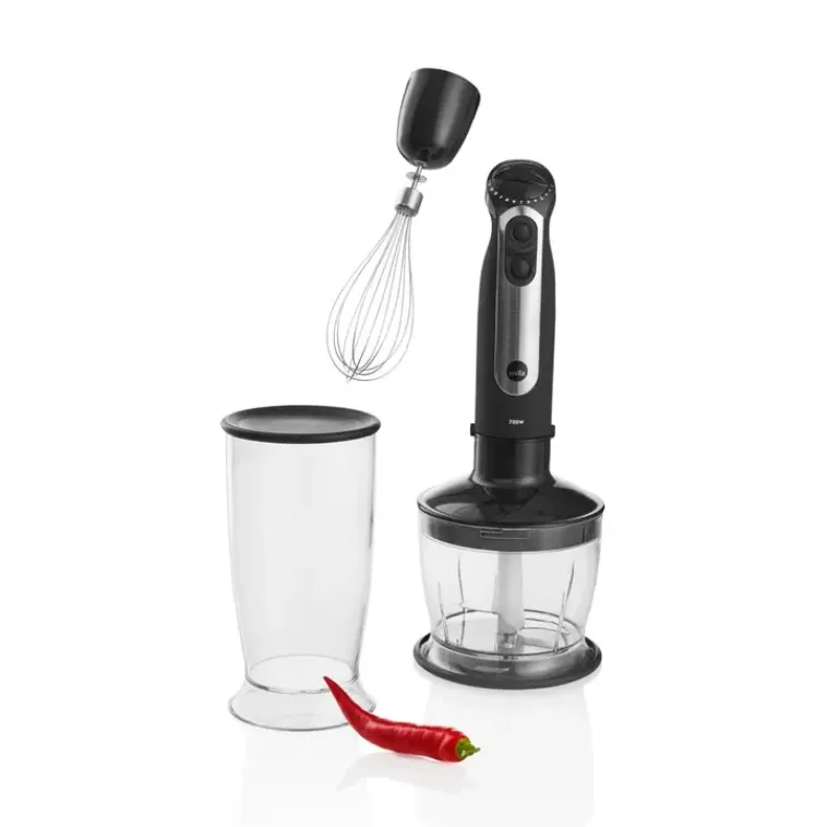 Tehokas Teräspintainen Sauvasekoitin 700 Watin Teholla. Säädettävä Nopeus. Kumipintaisesta Kahvasta Saa Hyvän Otteen. Mukana Vispilä, Seinäkiinnike, Kumipohjainen Astia Ja Minisilppuri Esimerkiksi Vihanneksia Ja Lihaa Varten. Kaikki Muut Irrotettavat Osat Voidaan Pestä Astianpesukoneessa, Mutta Minisilppurin Kantta Ei Tulisi Pestä Astianpesukoneessa. 700W. Säädettävä Nopeus. Kumipintainen Varsiosa Takaa Hyvän Otteen. Irrotettavat Astianpesukoneen Kestävät Osat (Katso Tarkemmat Tiedot Käyttöohjeesta). Vispilä Ja Sekoitusastia Mukana. Minisilppuri Kannella Ja Liukumattomalla Pohjalla Sipulin, Vihannesten Ym. Pilkkomiseen. Takuu 5 Vuotta.